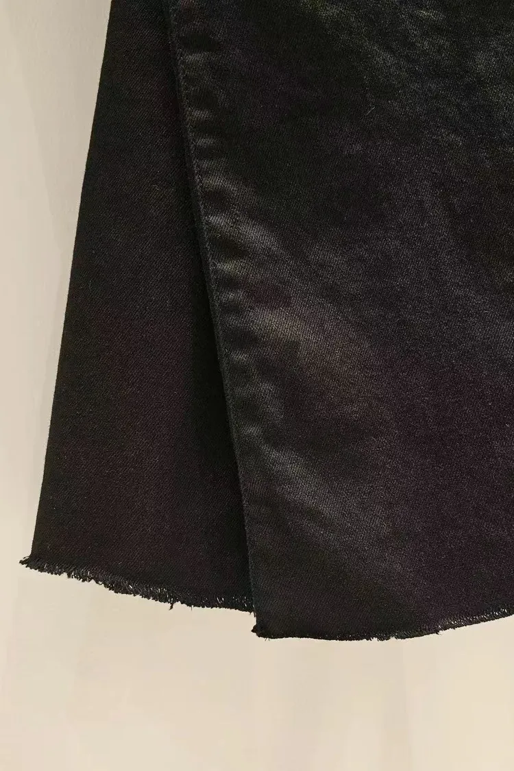 布料是一般偏薄厚度,有挺度但是不會硬,3%彈力超舒適,褲型久穿不易變形👌👍 顏色是純黑色,霧銀金屬副料,後腰頭有品牌皮標