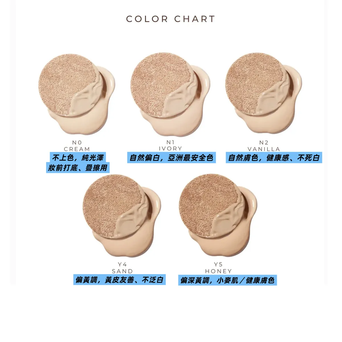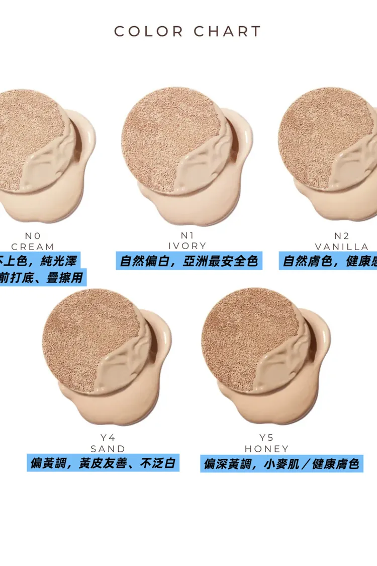 1️⃣ No Cream👉 透明無色款(不上色,純光澤/妝前打底、疊擦用)2️⃣ Y4 Sand👉 Y4 沙色自然膚(偏黃調,黃皮友善、不泛白)3️⃣ N1 Ivory👉 N1 象牙白(自然偏白,亞洲最安全色)4️⃣ N2 Vanilla👉 N2 香草白(自然膚色,健康感、不死白)5️⃣ Y5 Honey👉 Y5 蜂蜜健康膚(偏深黃調,小麥肌/健康膚色)