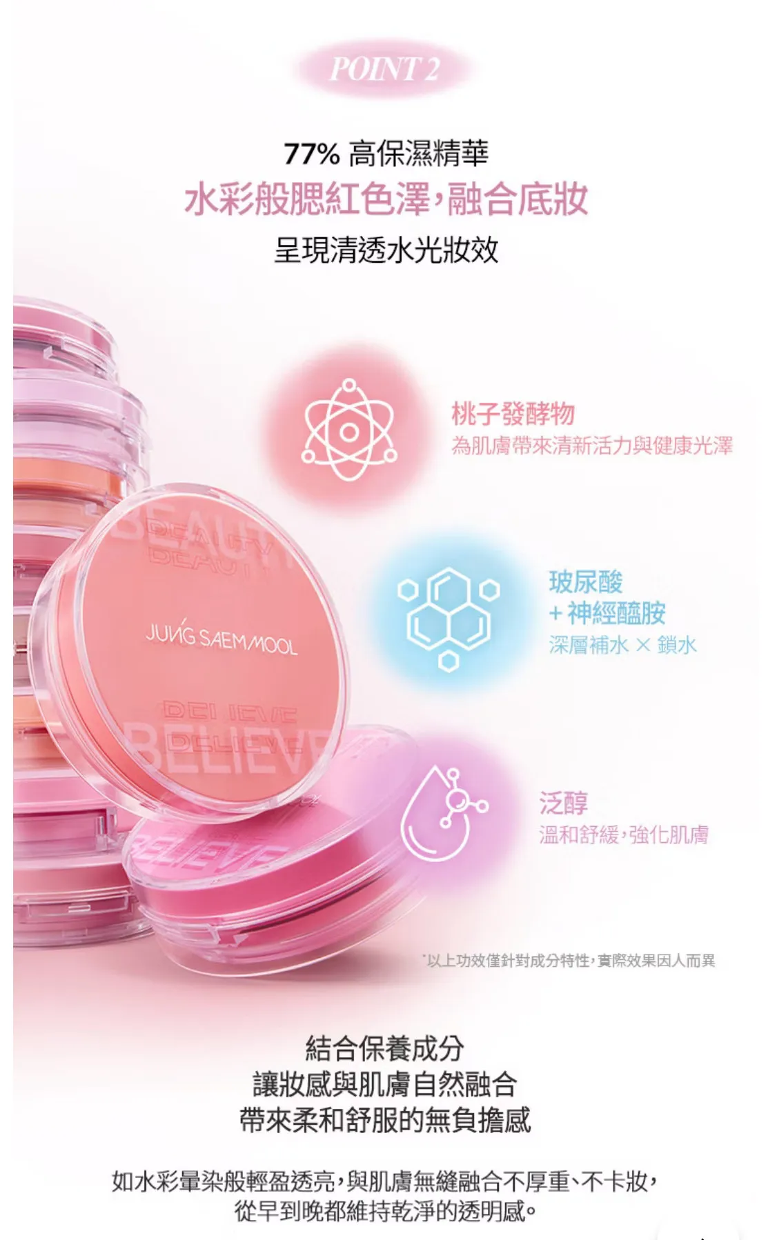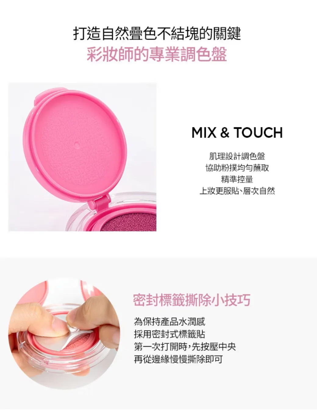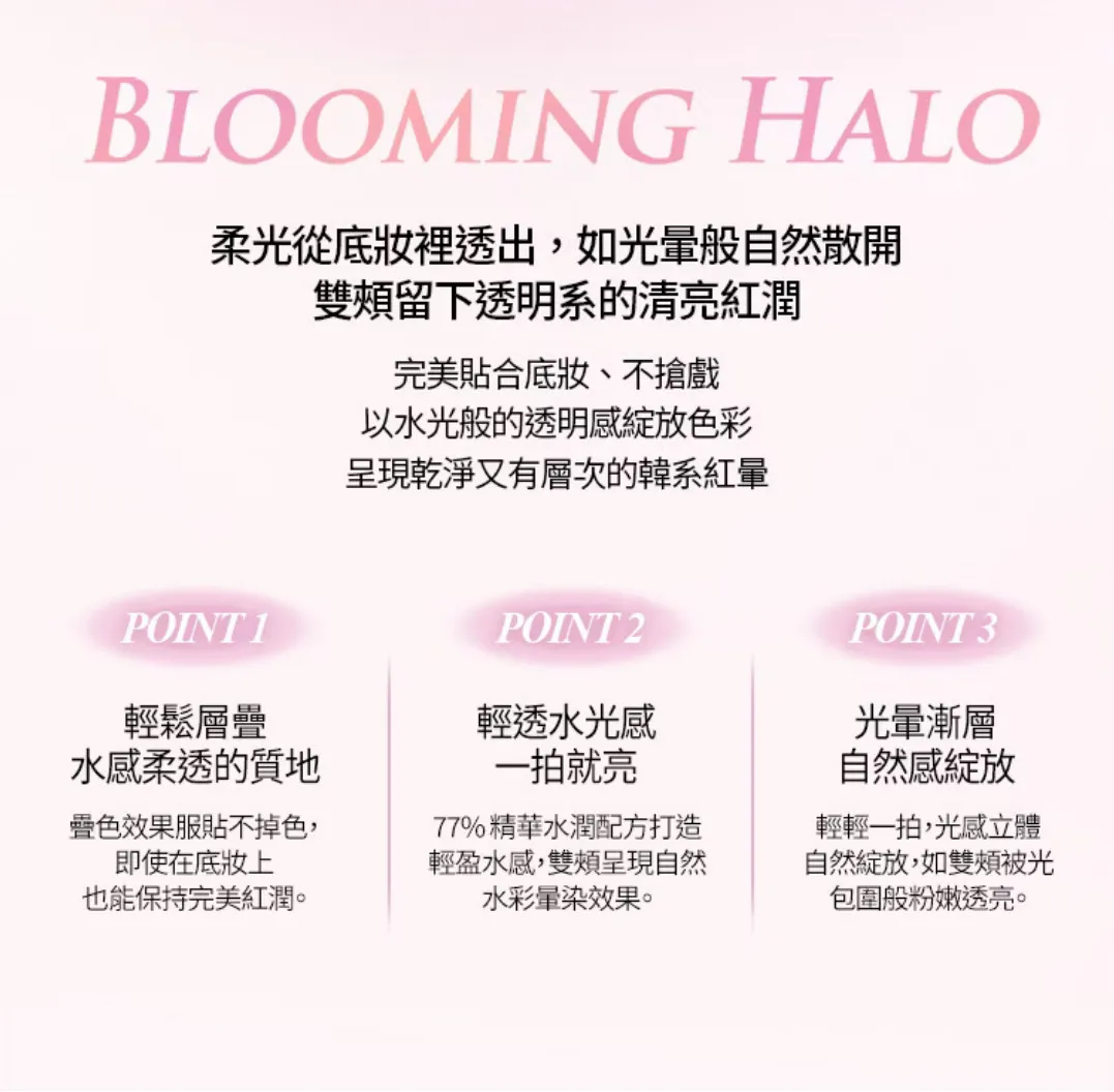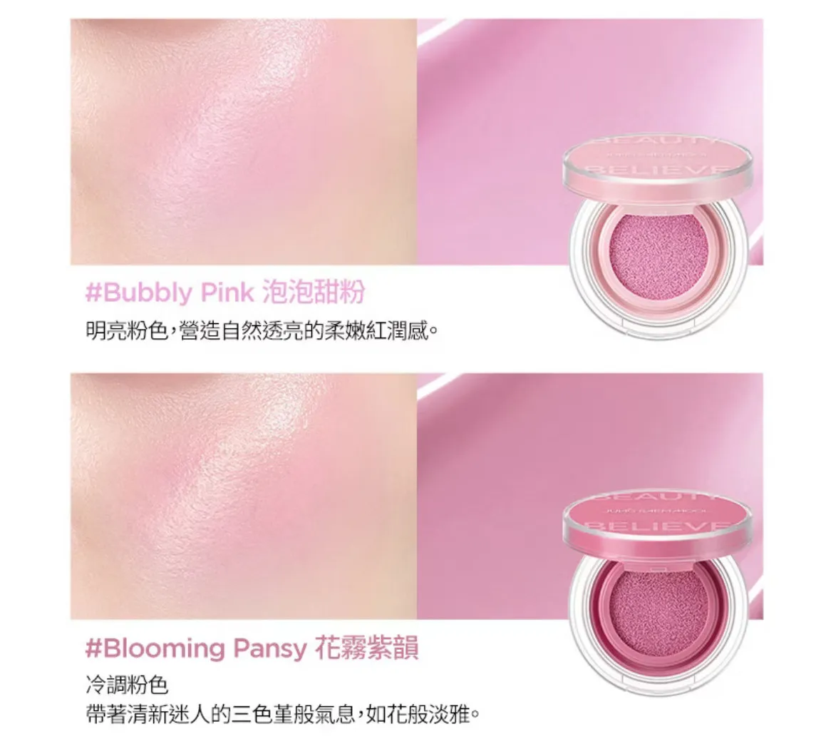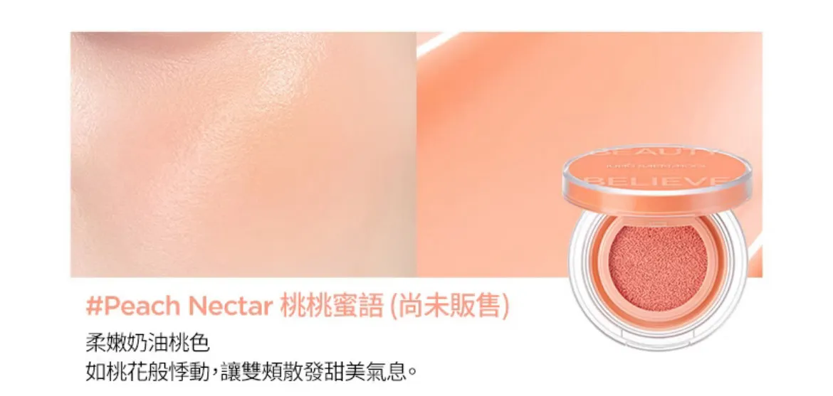 Artist Cushion Blush 氣墊腮紅(4 色) Bubbly Pink 氣泡甜粉 (嫩嫩粉色,少女感、氣色立刻有) Blooming Pansy 盛放堇紫粉 (偏冷調玫紫,顯白、有氣質) Peach Nectar 蜜桃花蜜橘 (溫柔蜜桃橘,黃皮超友善) Coral Halo 柔光珊瑚粉 (日常百搭款,自然好氣色)